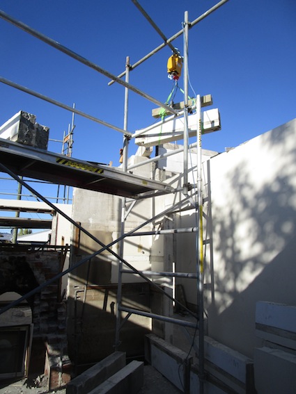 I had extended my mobile scaffolding with a steel outrigger and had attached the winch at the end of it.